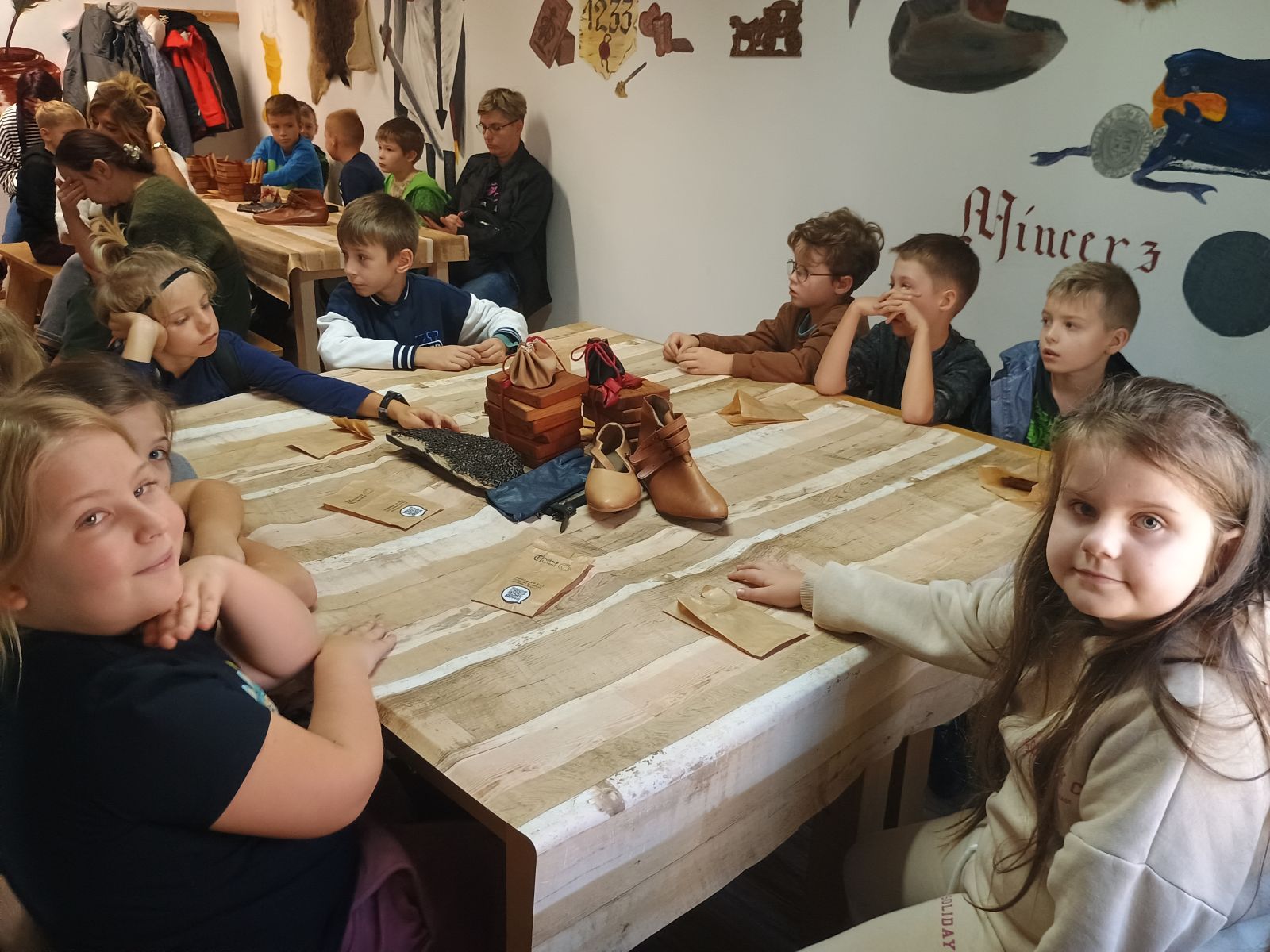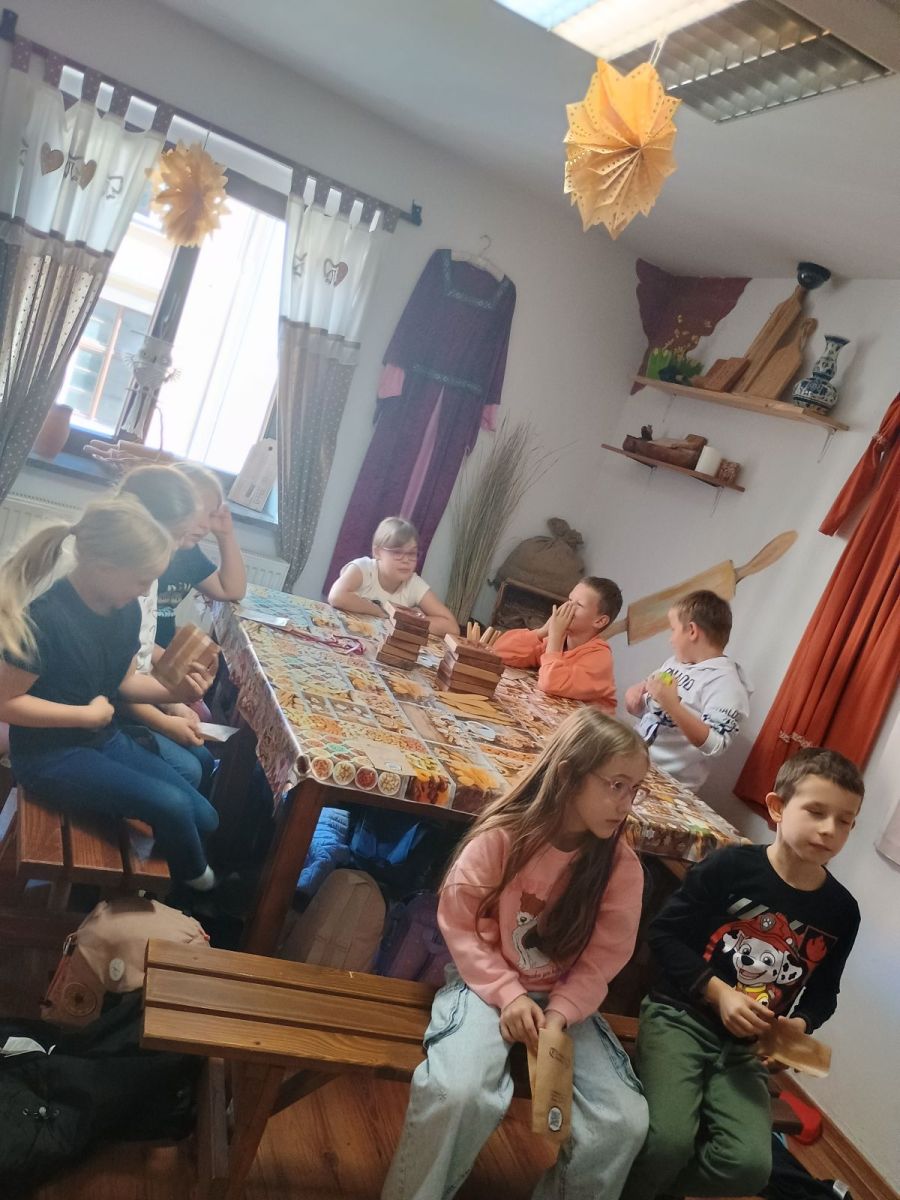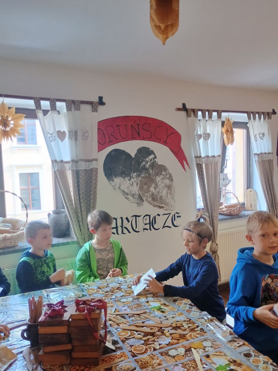 Dnia 09.10.25r uczniowie klas 2b i 3c wybrali się na wycieczkę do Torunia. Podczas wycieczki wybrali się do Planetarium na seans zatytułowany Kosmiczne ziemniaki. Podczas pokazu dowiedzieli się wielu ciekawych rzeczy o planetach, asteroidach i innych ciałach niebieskich. Film w przystępny i zabawny sposób tłumaczył zjawiska zachodzące w kosmosie, pokazując, jak niezwykły i różnorodny jest wszechświat. Po wizycie w Planetarium był spacer ulicami Torunia wspólne zdjęcia pod pomnikiem Mikołaja Kopernika. Odwiedziliśmy też Muzeum Historii Partaczy w którym pan przewodnik w ciekawy sposób opowiadał o życiu i pracy dawnych rzemieślników. Dzieci miały okazję zobaczyć oryginalne narzędzia, warsztaty oraz dawne wyroby rzemieślnicze. Wzięli udział w warsztatach wypieku piernika oraz warsztatach kaletniczych- tworząc sakiewki.